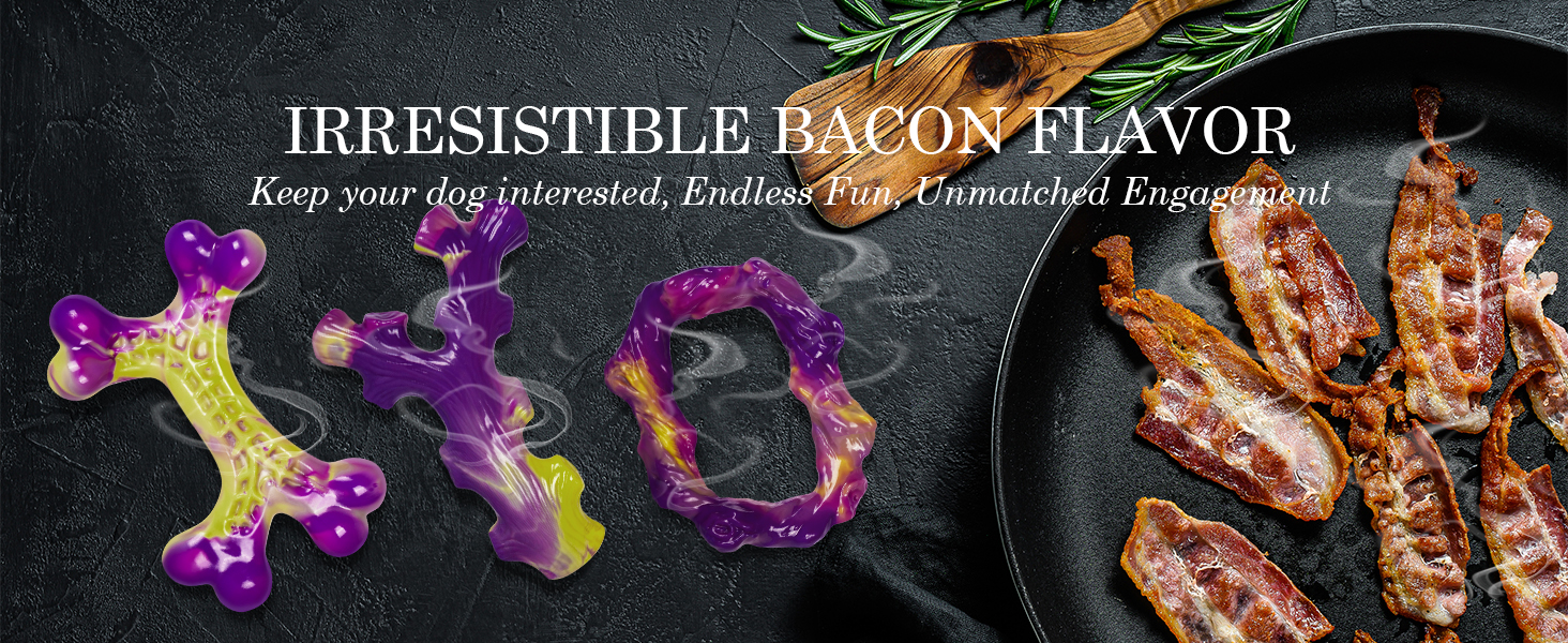 - BACON FLAVOR: 3 pack dog toys for large dogs are infused with the real bacon flavor, making them irresistible to dogs. Your furry friend won't be able to resist sinking their teeth into these toys, providing endless entertainment and peace of mind even when you're on the go.