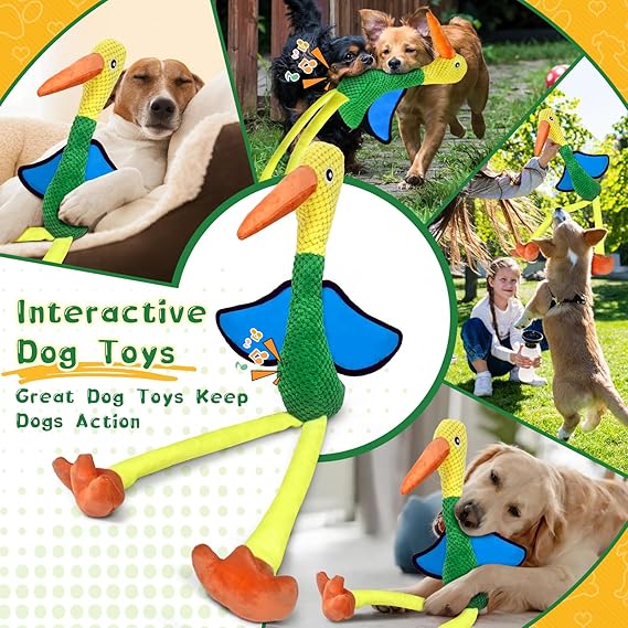 - 【Dog Squeaky Toys】This dog toy features an adorable duck design, paired with vibrant colors, instantly catching your dog's attention.The dog toy for small dogs not only hide a clever squeaker in the duck head, but also the body parts can make a sound when dog chewing. Squeaky dog toys provides entertaining fun and also stimulates your dog's curiosity and desire to explore. This dog chew toy is 14.5 inches tall and 8.6 inches long, making it the perfect companion for small and medium-sized dogs