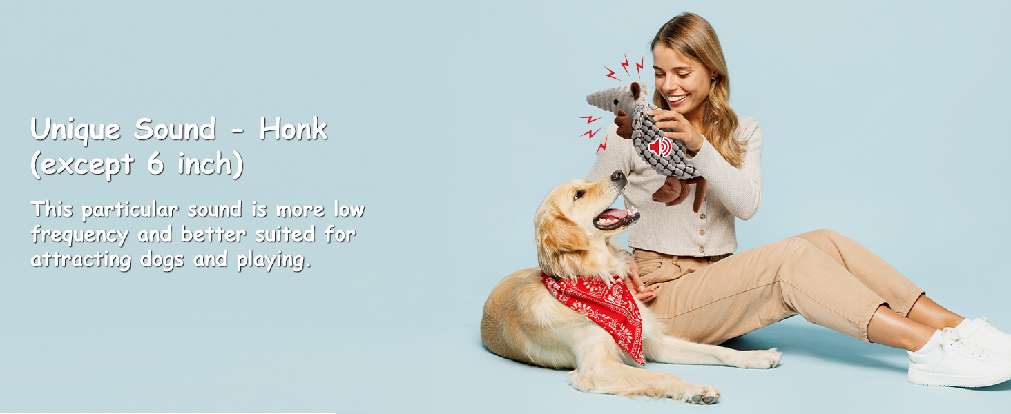 - Unique Sound - Hollypet Armadillo Squeak Toys (except 6 inch) make a sound that's not high pitched, but rather a unique and funny grunt sound that your furry friend will love. Unlike noisy bones, ropes, or other normal stuffed plush dog toys