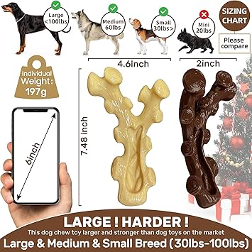- Easy to pick up and chew-The unique branch design is our original creation,uniquely designed for a paw-friendly grip so your pup can quickly grab them and get a good chew going.Think about it:Dogs don't have thumbs.excellent choice for dog gift whether you are looking to celebrate a birthday or christmas with your furry friend.The 7.4 inch dog chew toy is ideal for medium and large dogs.It is also suitable for the growth stage of dogs,ensuring that your furry friends are happy and healthy.Please refer to the toy size to determine if your dog's body type is suitable for this toy
