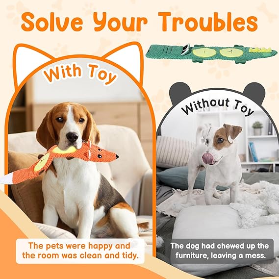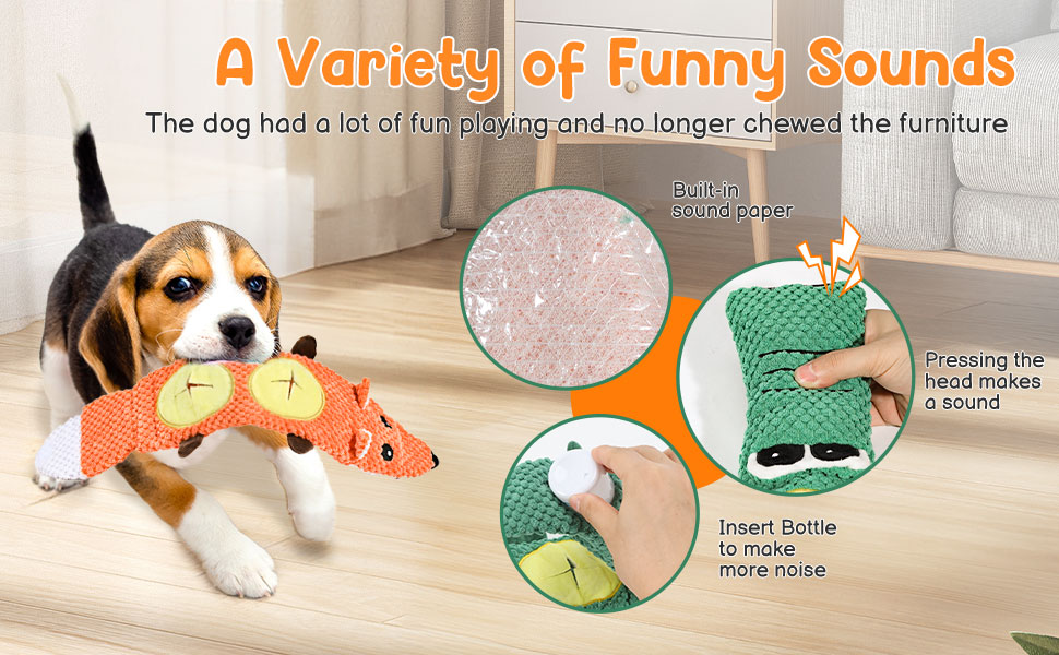 - Multi-Sound Engagement System Dual Squeakers + Loud Crinkle Paper Attract Play Interest! Built-In Squeakers Excite Play Instincts + Textured Surfaces Clean Teeth. Keeps Dogs Busy For Hours, Reducing Anxiety & Destructive Behavior.
