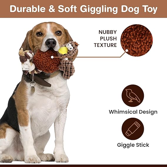 Gigglers Chicken Plush Dog Toys have a tube inside that makes a giggling sound when your dog shakes the toy.