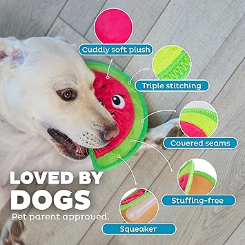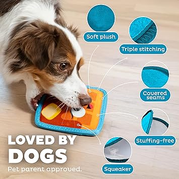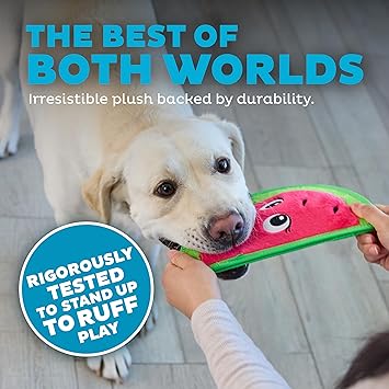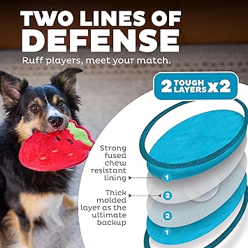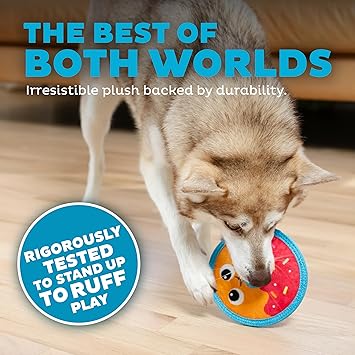 Tough Skinz is Outward Hound's latest tough toy innovation that combines the irresistible aspects of a plush toy with the premium strength of a molded toy. Backed by not one but TWO layers of durability on either side, Tough Skinz feature a strong fused chew-resistant lining beneath their soft plush exteriors, plus a thick molded layer underneath to provide the ultimate durability against the ruffest players out there. It's the best of both worlds, combining pet parent-approved strength with everything your dog loves about plush toys. The dual-layer protection has been put to the test by rigorous players and the most determined chewers to ensure long-lasting fun. For even more strength, each Tough Skinz toy features triple stitching as well as covered seams. Toss them, fetch, play a game of tug, our Tough Skinz are built to withstand whatever type of play your dog prefers. Stuffing-free and filled with a jumbo squeaker, this toy levels up the entertainment with superior durability as the ultimate perk. WARNING: For dogs only. Contains small parts. Product contains one continuous thread to enhance durability. If thread unravels, please discontinue use. Keep out of reach of children. When choosing a toy, make sure to choose an appropriate size toy for your dog. No toy is indestructible. ALWAYS supervise your dog when using a toy of any kind. Inspect toys regularly for damage and remove and replace if broken, or if parts become separated, as serious injury may result. Ultimately, your pet's safety is your responsibility.