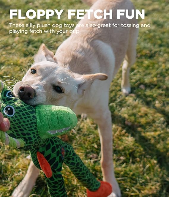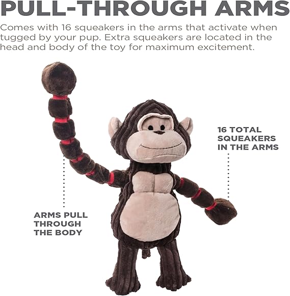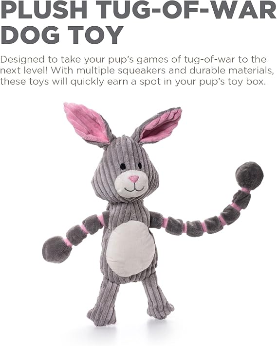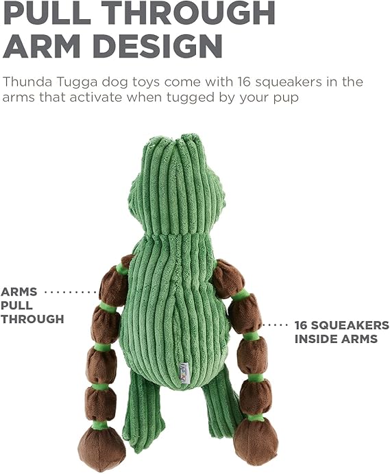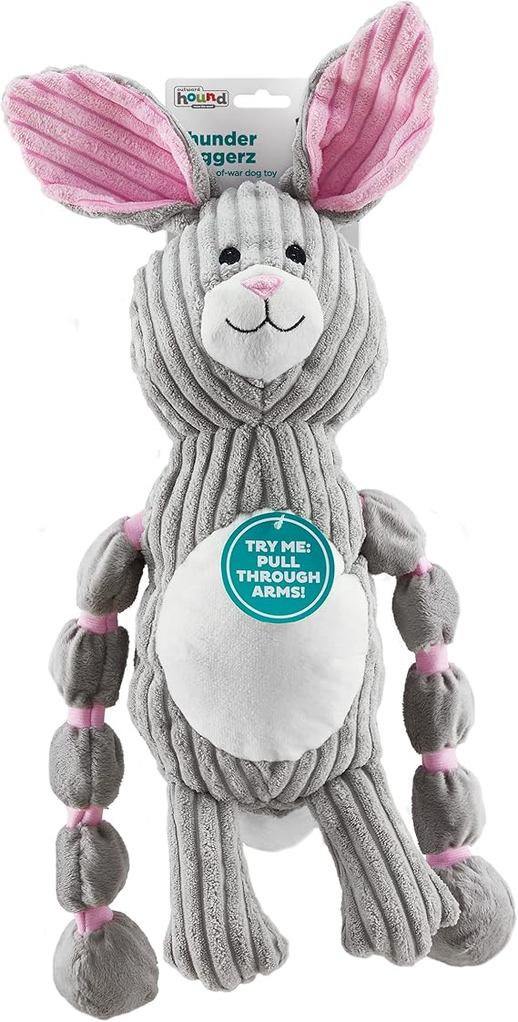 Ready, set, tug! The Outward Hound collection of plush Thunda Tugga and Thunda Tugga Leggy dog tug toys are perfect for taking your games of tug-of-war to the next level. Thunda Tugga Leggies come with 14 individual squeakers in the legs that activate when tugged by your pooch while extra squeakers in the head and body activate when bitten. The arms are made up of twisted rope to act as a handle when playing with your dog. Unique K9 Tuff Guard technology includes denier canvas lining, nylon-fused backing, and double stitched seams for added durability. The fun doesn't have to end at tugging as these soft, floppy dog toys are also great for playing fetch with your dog. Both Thunda Tugga and Thunda Tugga Leggy dog toys are available in multiple styles. Note, these plush dog toys are not meant to be used as chew toys. SAFETY & CARE: When choosing a toy, make sure to choose an appropriate size toy for your dog. No toy is indestructible. ALWAYS supervise your dog when using a toy of any kind. Inspect toys regularly for damage and remove and replace if broken, or if parts become separated, as serious injury may result. Intended for dogs only. Keep out of reach of children.