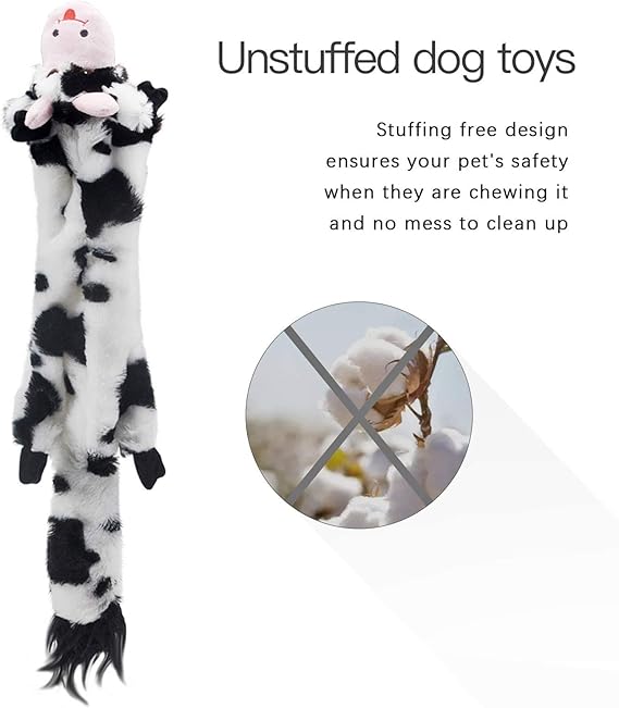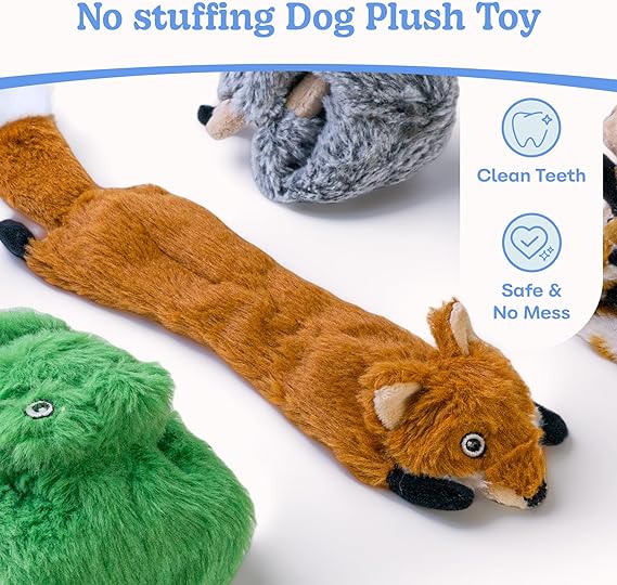- No Stuffing Dog Toys, Safe to Play: Unstuffed dog toys means no mess and no choking risks. Embroidered eyes effectively keep pet always in a safe environment when chewing or playing. Soft puppy teething toys can provide gum massage and relief oral discomfort. Machine washable and skin-friendly material allows dogs to bite freely without causing any damage to their teeth