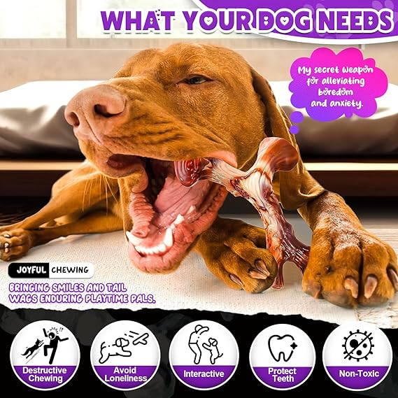 - 100% VALUE FOR MONEY: These tough toy for dogs, much cheaper option to keep her occupied than something like bully sticks which she goes through in a few hours. 4 unique shapes that make it easier for dogs to pick up and enjoy chewing, while also helping to clean their teeth and promote dental health. This affordable set of four durable dog bone toys will provide dogs with longer-lasting fun. Buy our nylon bones for dogs and your wallet will thank you