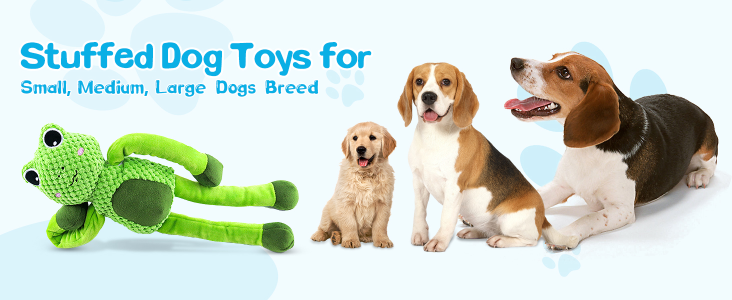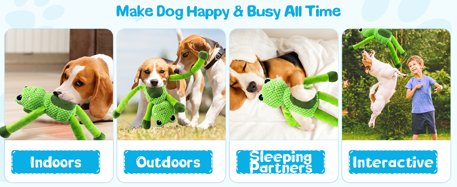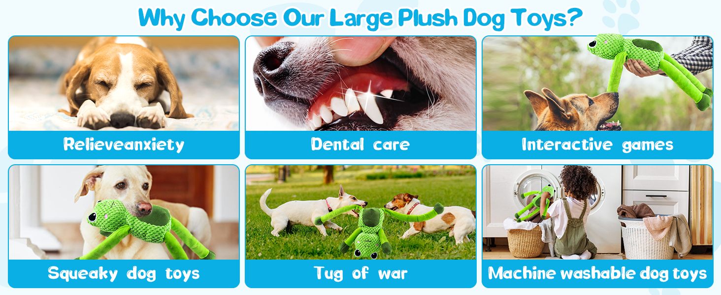 - 【Squeaky Dog Toys】Want to keep your dog persistent enthusiasm?This plush dog toys have three squeaker will attract dog’s interest and keep them entertained;The squeaker makes dogs go wild when dogs play this frog stuffed dog toys, while the hands and feet become dog tug toys for both large dogs and puppy