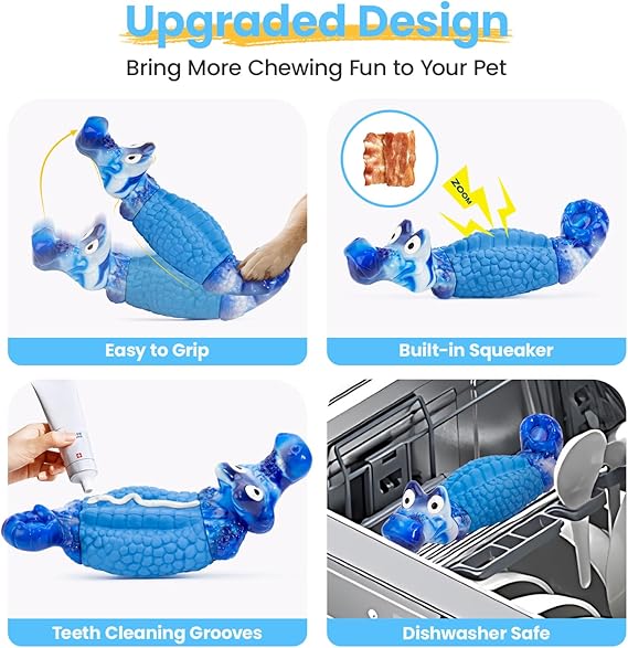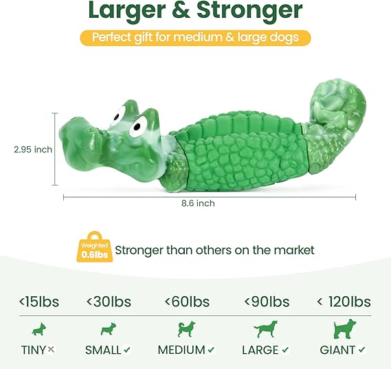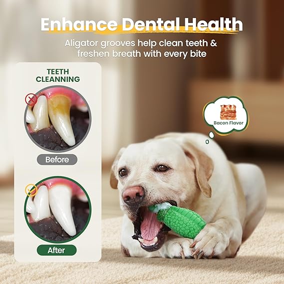 - Dental Care: The cute alligator-shape large dog toys will attract your pet's interest, while the intricate textured surface works like a toothbrush. When your pet chews this indestructible large dog toys, the textured surface rubs against their tooth, helping to wipe off stains and reduce tartar. Besides, you can apply a thin layer of toothpaste or peanut butter on the grooves of the dog toys for large dogs, improving dental health while interacting with or training your pet
