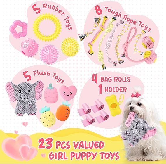 - Pink Dog Toys for Female Puppy: Great for female dogs (under 25 Lbs), including 8 rope toys, 5 squeaky plush toys, 4 rubber chew toys, 1 treat ball, 4 dog bag rolls and 1 dispenser. Cute pink design creates princess-like happiness for your puppy