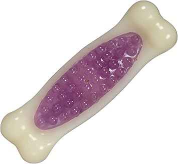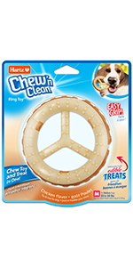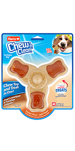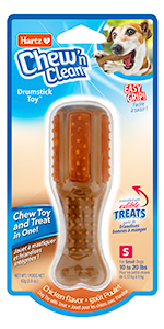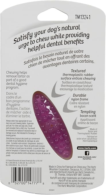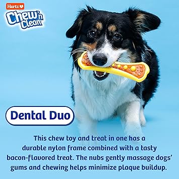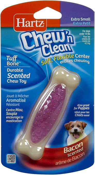 Your dog is hard-wired to chew, chew, chew. Encouraging this instinctual behavior by providing your canine companion with an appropriate chewing item can promote mental and emotional wellbeing along with dental benefits. The Hartz Chew 'n Clean Tuff Bone is a long-lasting chew toy constructed from durable materials that withstand mild to moderate chewing. The unique design boasts cleansing and tooth-scraping abilities. Enriched with a tempting bacon scent, the Tuff Bone entices dogs to exert their need to chew, while helping keep teeth and gums clean to reduce the formation of plaque and tartar. Available in a variety of sizes and colors to suit every dog's needs. Remember to supervise your pup with any toy.