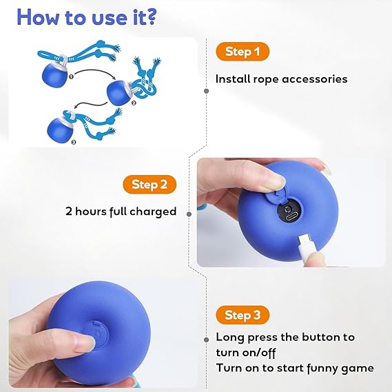 - Jumping dog ball with 3 Modes: Best moving toys for bored dogs (Slow speed recommend on hard floor, Fast speed could be rolling on carpet, Interactive mode will only reactive when dogs touched) , Distinguish working mode by LED lights. Long press button to power on, Blue - Purple - Yellow in turns, please view pic 3