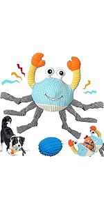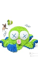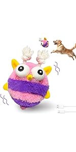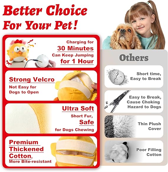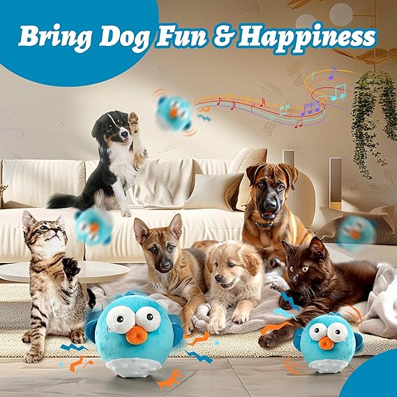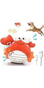 - [THREE MODE INTERACTIVE DOG TOY]: There are three modes for squeaky dog toys: bouncing, singing and recording talking, puppy can activate the interactive toy by tapping it to make them bounce. Bouncing ball can dance continuously for an hour, after charging with the provided charger for 30 minutes, with long-lasting bouncing that is not easy to break. Cute dog plush toy with filled crinkle paper, music and rustling sounds will increase the interest of dogs in playing.