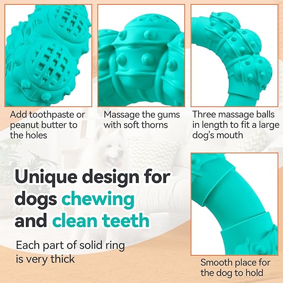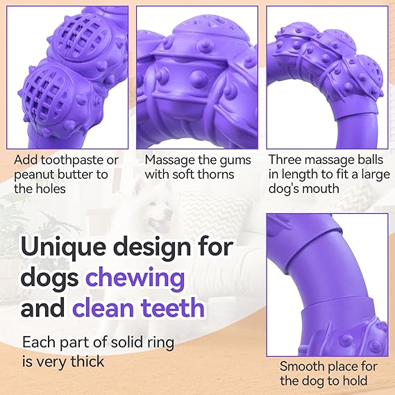 - Upgraded dog teeth cleaning toy: Dog ring toy is specifically designed for the dental health of dog. Holes in dog toy can be used to clean teeth with toothpaste. The countless soft thorns can not only help dogs remove plaque and tartar, but also relieve the itching and irritability during puppy teething.The three balls can fully cover the mouth of the big dog. Therefore, dog chew toy rings can not only be used to clean the teeth for all dogs, but also can be used as puppy chew toys for teething