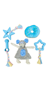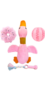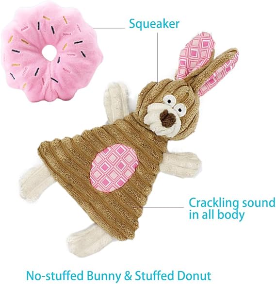 - 【puppy toys for boredom and stimulating】The head of crinkly bunny has a squeaker in it and the body has crinkling, so it’s interesting to play with. And, the stuffed doughnut can also make sounds when it receives the squeeze. They can continuously attract the puppy's attention and keep dogs busy and out of boredom.