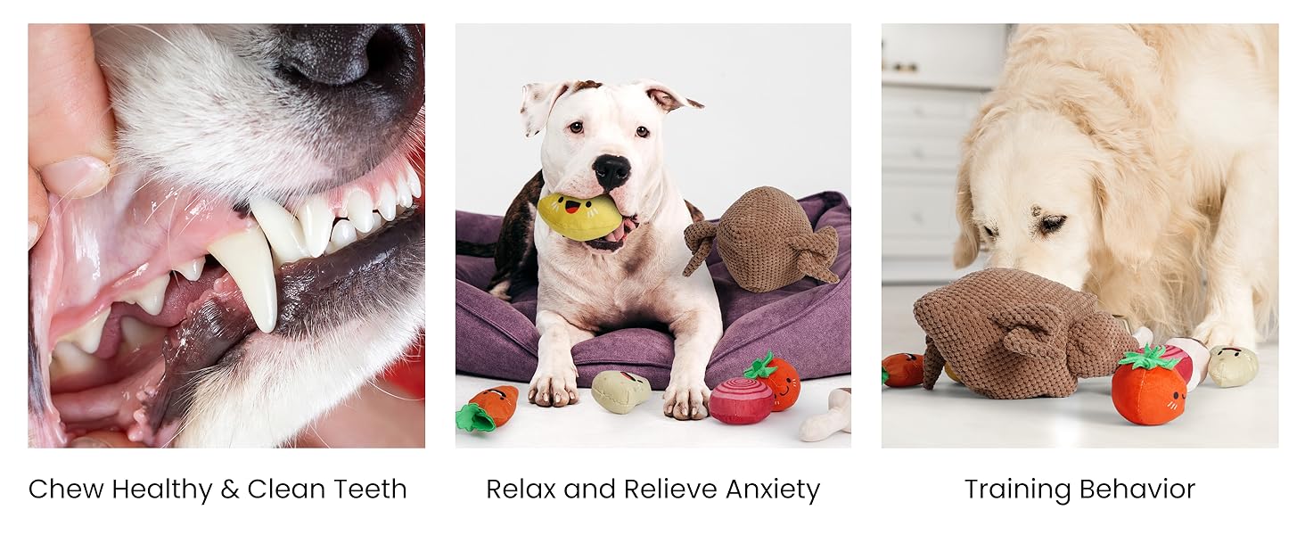 - Engaging Dog Toys: These toys are designed to keep your furry friend entertained and mentally stimulated. Perfect for small and medium-sized dogs, they come in fun and colorful shapes, including onions, potatoes, mushrooms, tomatoes, lemons, carrots, and a turkey