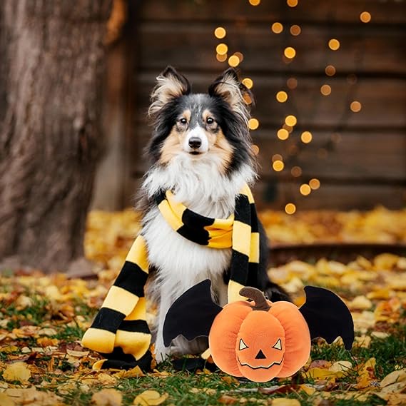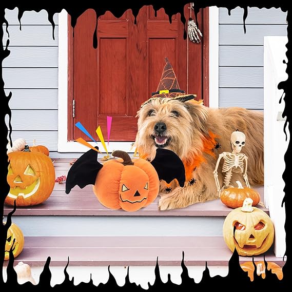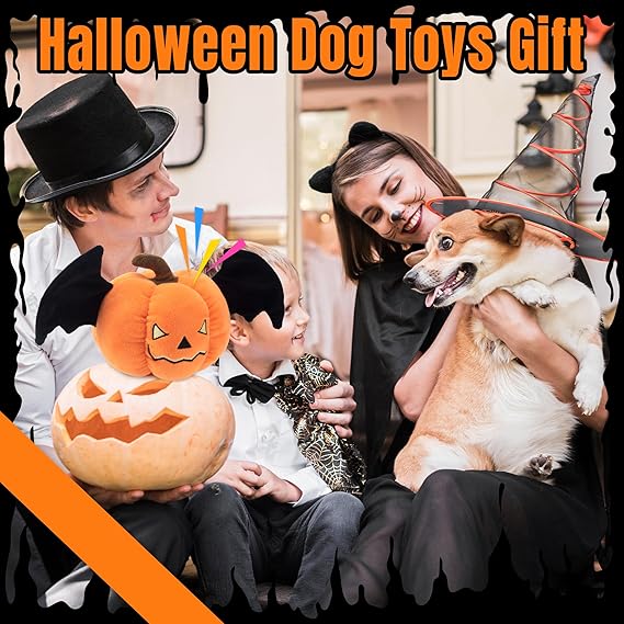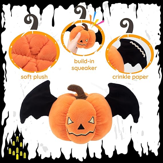 - Evil Pumpkin Dog Toys: Fun Halloween dog toys, exquisite embroidered, crinkle paper wings and build-in squeaker that can make sounds to attract dogs. This is a great dog toy to keep them busy