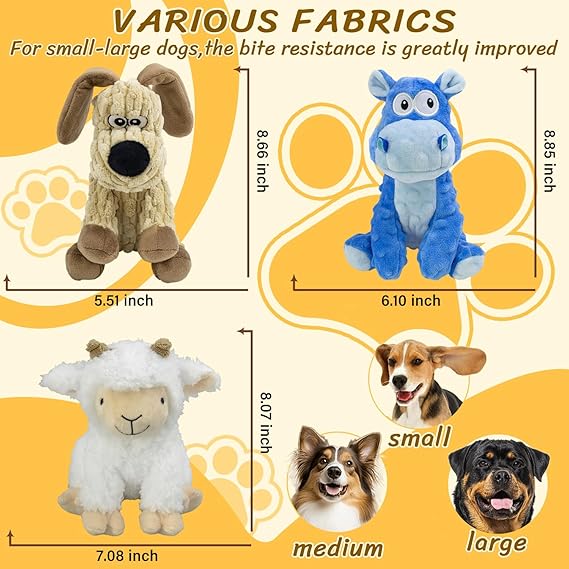 - UNIQUE DESIGN & MORE FUN: Our Stuffed pet toys come in fun animal designs. Available in Hippo,Dog and Sheep, these cute dog toys will spark your dog’s natural instincts to play. Buy single or super-value pack to keep your dogs busy for hours!