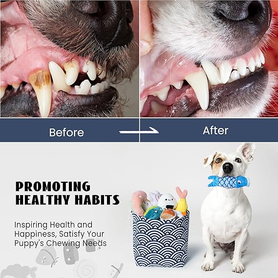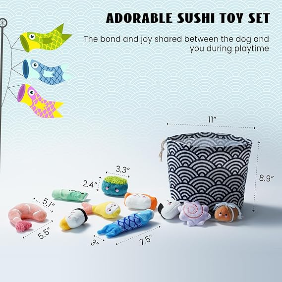 - Surprise Gift: Those plush toys with 10 different sushi-themed elements such as carp streamers and delicious rice balls. Sized to fit the paws and mouths of puppies, small dogs, and medium-sized dogs. Whether it's tossing, cuddling or digging, it's fun for your pup and is a heartwarming gift that can delight your pup or surprise dog lovers.