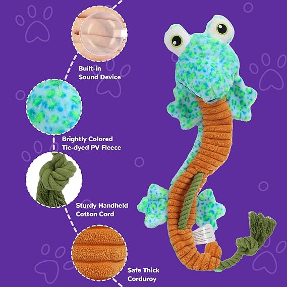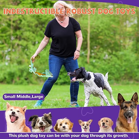Crinkle Dog Toys Squeaky Plush No Stuffing Cute Puppy Stuffless Tough Rop Pull Toy, Fun Dog Stuffed Animals Durable Chew Set for Small Medium Large Pup (Large, Lizard)