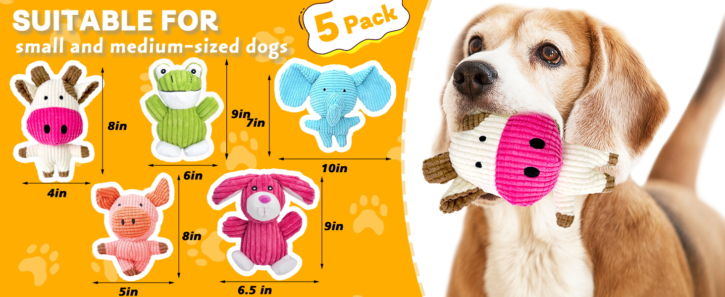 - 5-Pcs Value Dog Toys Pack: Squeaky dog toys pack includes five of the most popular plush dog toys - cows, pigs, frogs, rabbits, and elephants, very suitable for small, medium or large dogs to chew. Dog toys to keep them busy. Give your dogs endless fun with 5 durable plush dog toys!