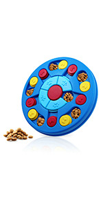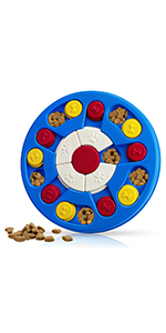 - 【CHALLENGING DOG PUZZLE TOYS】Our dog puzzles for smart dog is designed with more challenging skills , not too easy. Your pups have to learn how to combine multiple steps to retrieve the hidden treat.They need to learn how to move the red round slider to the center for hide food with a right point. And when want to spin the centre wheel , have to slide the red slider away . At first try, smart pets feel hard to finish the game in seconds, keep long intereste in playing.