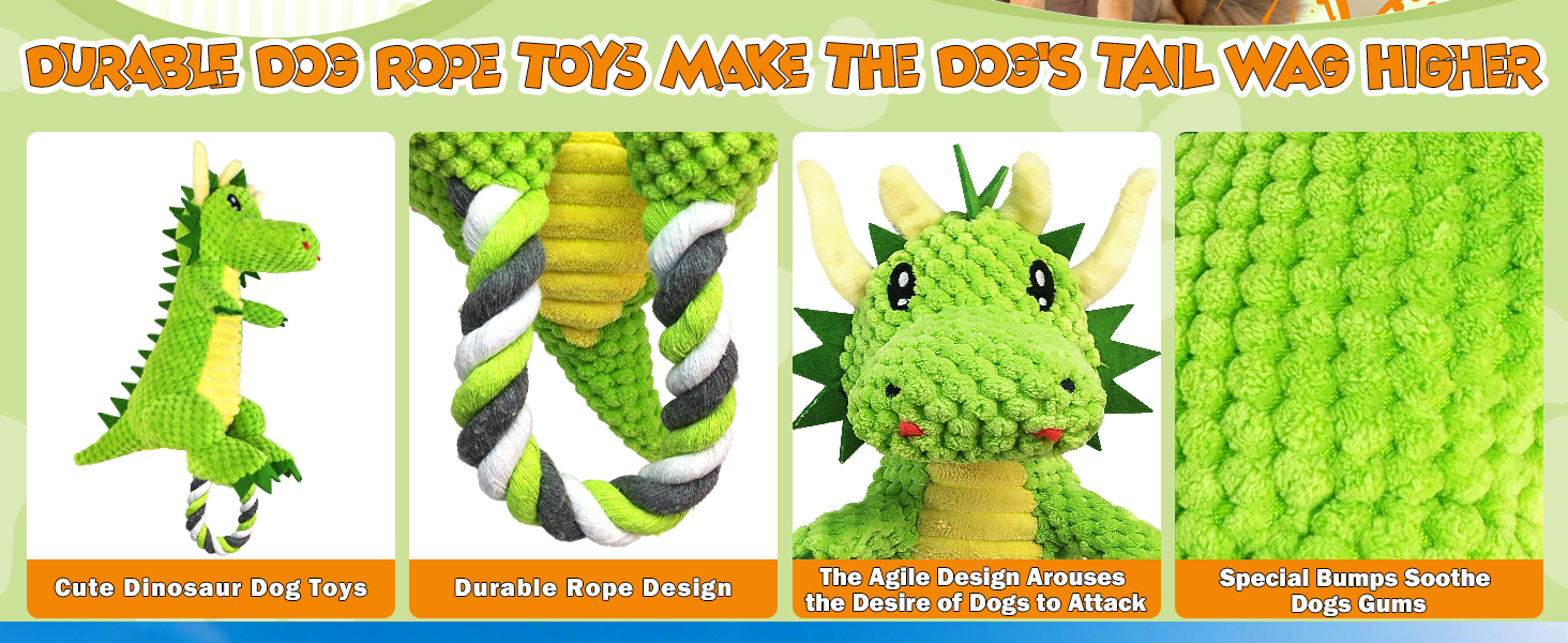 - 【Durable Dog Toys】Adorable dinosaur-shaped,Vibrant green dog toys.Every seam is double stitched and reinforced to ensure that our chew toy lasts through countless chews and teething.The dog rope toy is the ultimate toy for your furry friend and no dog can resist it
