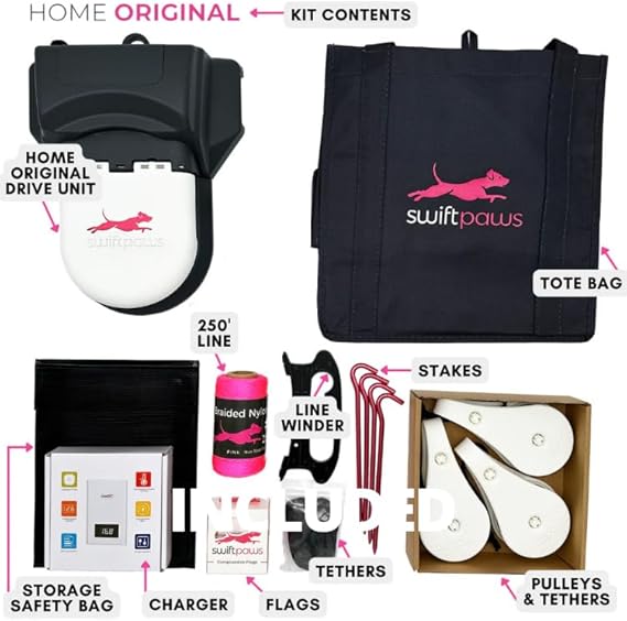 SwiftPaws - Home Original - Chase Toy - for Dogs - Flag Lure Course - Interactive Dog Enrichment Toy - Includes Main Unit, 3 Pulleys, Charger, Flags, Line, Stakes, Tethers