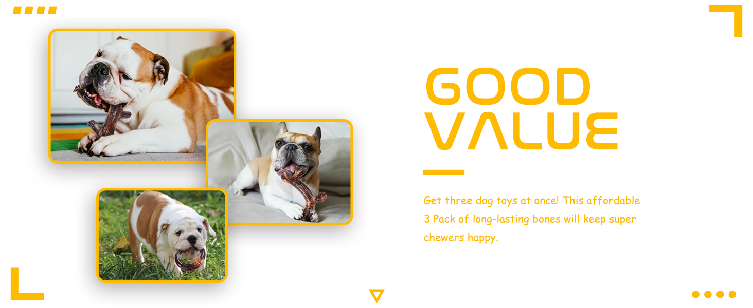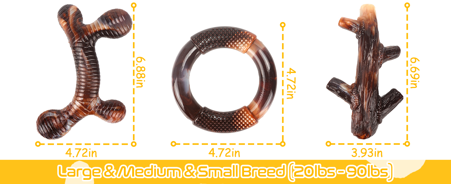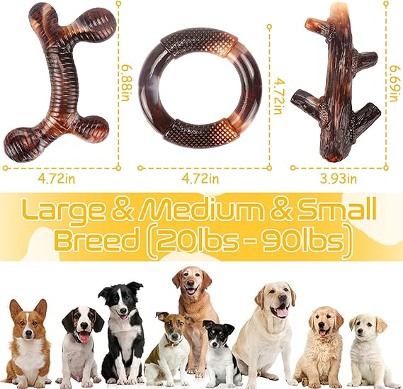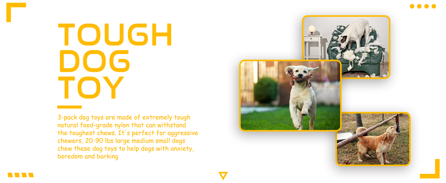 - Indestructible dog toys for aggressive chewers - These three pack dog toys for large dogs are all made of food-grade nylon, which are tougher than real bones and withstands the strong chewing of a dog. No longer have to worry about super chewer dog toys being easily broken and replaced frequently. (The marks that appear after chewing are not damaged)