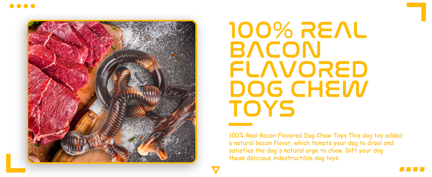 - Irresistible real bacon flavor - Smell the bacon? 100% Real Bacon Flavored Dog Chew Toys will tempt your dog to drool and satisfy the dog's natural urge to chew. Gift your dog these delicious indestructible big dog toys