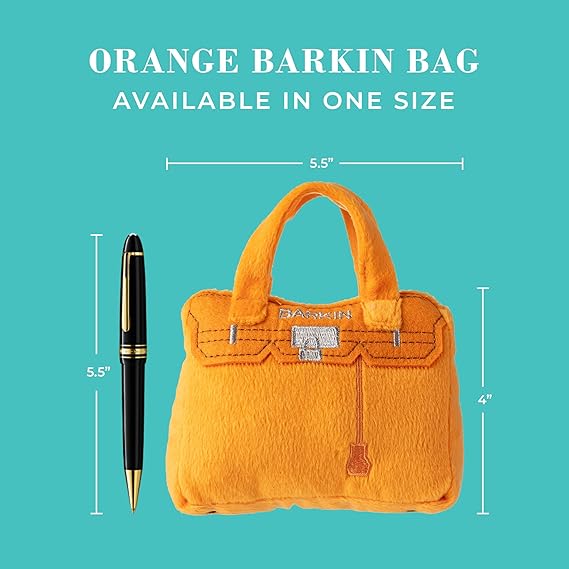 - Funny Parody Plush Dog Toy: Let your furry fashionista fetch or strut some fashion-forward fun with this Barkin Bag, handbag dog toy, that features a bright orange plush exterior with a built-in squeaker hidden inside. It’s a playful, cute interactive dog toy that combines style & fun. One Size 5.5"x4"x1.5".