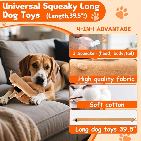 - 【Engaging Long Design with squeaker】unique 13.8“ hot dog sahpe toy! Equipped with squeakers in the head, this toy attracts your dog's attention and stimulates their natural curiosity, making playtime even more exciting.