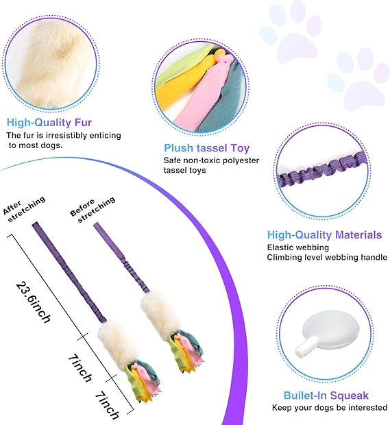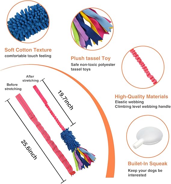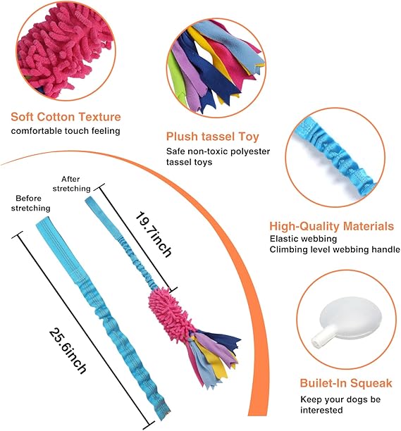 - Safe and Durable Material: Our compact bungee tug toy for dogs is made of high-quality faux fur, which is not just soft for your dog to grip on to but also extremely satisfying. The dog tug toy is having a squeaker inside the material which is very suitable for dog fun, dragging, chewing, shaking, war and grapple