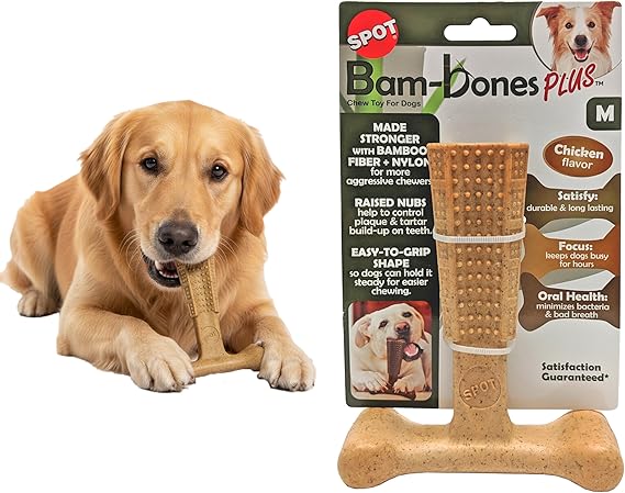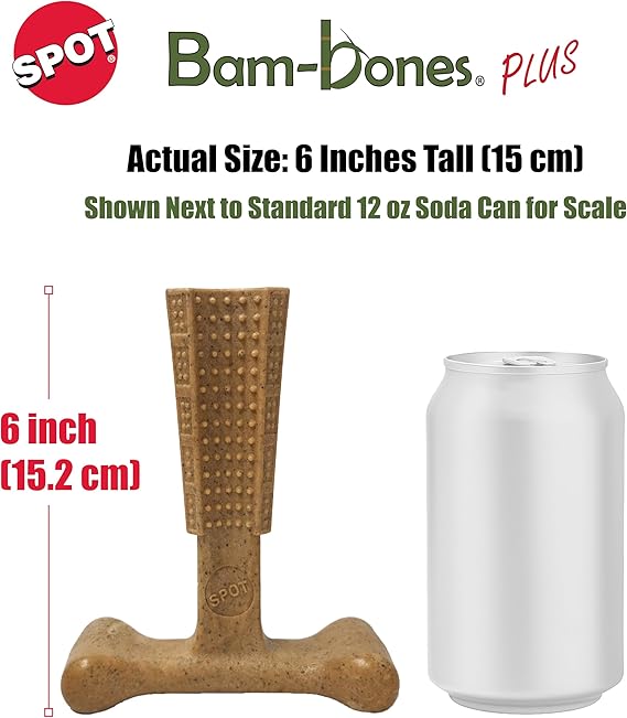 The SPOT Bam-bones PLUS T-Bone is the ultimate dog chew toy for aggressive chewers and teething puppies. Made from a durable blend of bamboo fiber and nylon, this sturdy toy is designed to satisfy your dog’s natural urge to chew while offering a safe, long-lasting outlet for their energy. Whether your dog is a large breed super chewer or a teething puppy, this toy is built to handle it all. With its tough construction, it’s perfect for dogs that need a toy capable of standing up to heavy chewing, making it one of the best puppy chew toys for teething and one of the toughest super chewer dog toys for large breeds. Designed for durability and promoting your dog's health, the SPOT Bam-bones PLUS T Bone helps improve dental hygiene by cleaning teeth and massaging gums while your dog enjoys chewing. It’s a great option for keeping your dog engaged, providing both enrichment and oral care in one product. The ergonomic T-bone shape features paw pads that make it easy for your dog to grip and enjoy. This chew toy also helps reduce stress and anxiety, offering a tasty chicken flavor that keeps dogs occupied and engaged, providing an excellent outlet for excess energy. Perfect for dogs that suffer from boredom or anxiety, the SPOT Bam-bones PLUS T Bone is a great addition to any dog's toy collection. As with all dog enrichment toys, it's important to regularly inspect the toy for signs of wear. Please review the included chart to know when to discard the current toy and replace it with a new one. While the SPOT Bam-bones PLUS T-Bone is designed to be incredibly sturdy and long-lasting, no toy is indestructible. For your dog’s safety, always replace worn-out toys to prevent potential choking hazards. With SPOT Bam-bones PLUS T-Bone, you’re giving your dog a tough, durable, and safe chew toy that not only satisfies their chewing needs but also promotes better health and reduces destructive behavior in and around the home.
