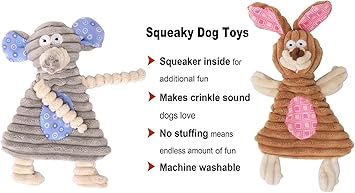 --These unstuffed toys not only make a squealing sound, but also crinkling, provides long-lasting entertainment. Absolutely will satisfies your dogs natural instincts. Keep them busy and happy.