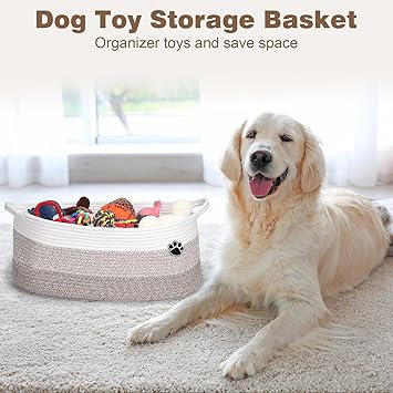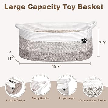 Dog Toy Basket, Toy Box and Bin for Dog Cat Storage, 19.7" X 11" X 7.9" (30L) Large Woven Rope Basket for Blanket Storage, Living Room, Bedroom, White & Brown