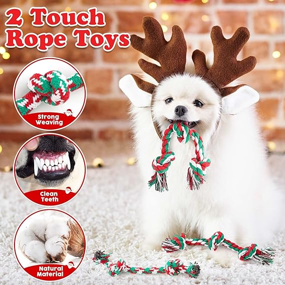 - 【Christma Fun Times】Provide hours of fun. The treat ball can exercise dog's intellect, the rope toys can be used for tug-of-war and fetching, while the squeaky plush toys attract the dog's interest, Whether you participate in the game or not, your dog can be happy, give you a choice to relax.
