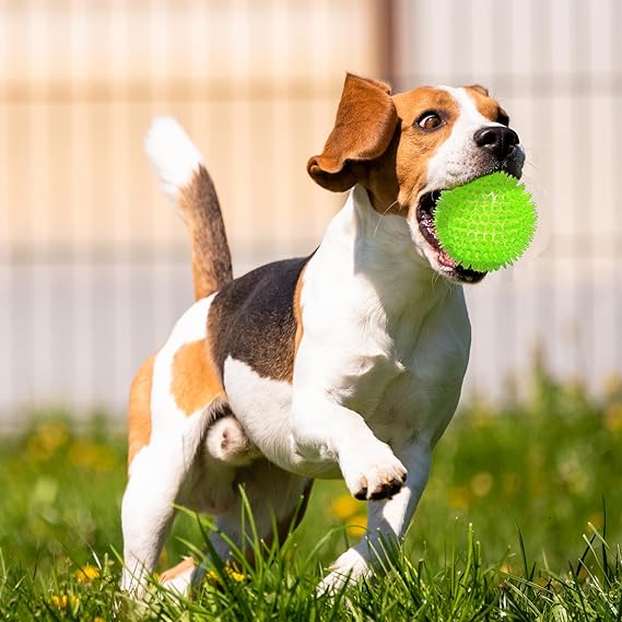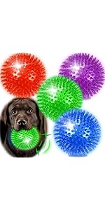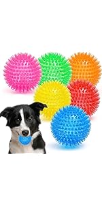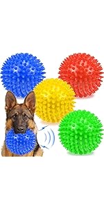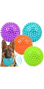 - 4 Pack large dog toy balls in different bright colors. 4.5" large size dog balls are not easy to roll under the sofa. With long pliable spikes, dogs of any size any breed can easily pick up this ball. A great bundle of dog toys for large, medium and small dogs