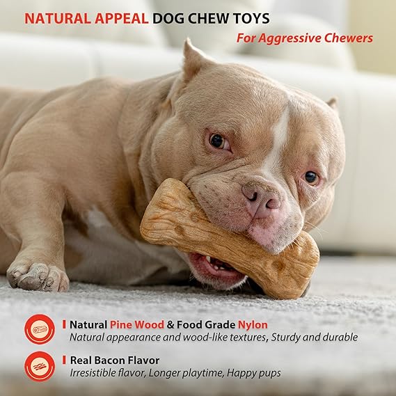 Willjoy Dog Chew Toys for Aggressive Chewers, Tough Dog Toys for Aggressive Chewers, Pine Wood and Nylon Indestructible Dog Toy, Bacon Flavor Large Dog Toys to Keep Them Busy
