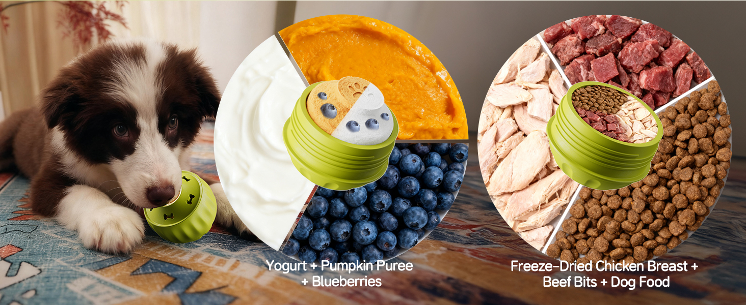 - Slow Feeding DIY Recipe Recommendations 1.Yogurt + Pumpkin Puree + Blueberries 2.Chicken Breast Broth + Diced Cooked Chicken Breast + Shredded Carrots 3.Coconut Milk + Fresh Apple Puree + Dental Biscuit Crumbs 4.Pumpkin Puree + Steamed Potato Puree + A Small Amount of Unsalted Chicken Broth
