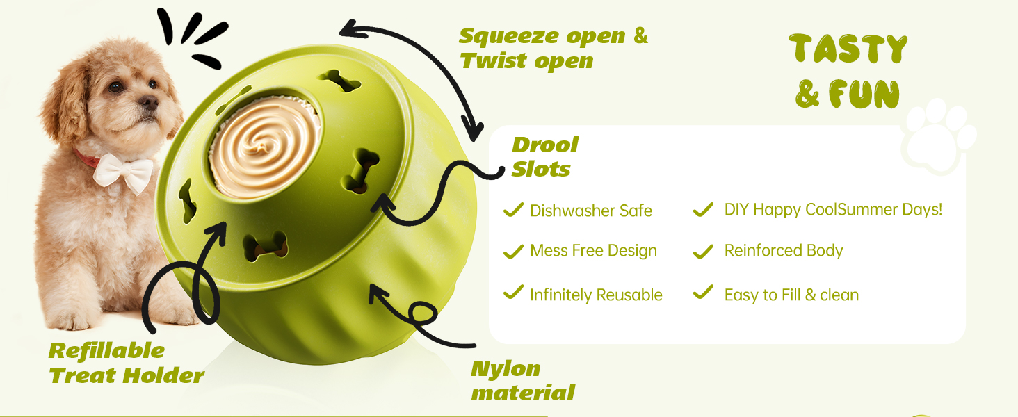 - 【stimulating dog toys】 A freezable treat-dispensing dog toy keeps your dog cool while chewing. It comes with simple recipes for easy getting started, perfectly fits summer refreshment, and opens up a new way to play with ice. DIY recipes reduce the cost of buying commercial snacks!