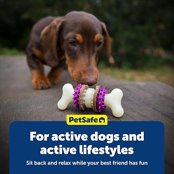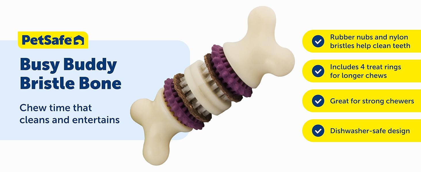Turn playtime into healthy fun with the PetSafe Busy Buddy Bristle Bone, the ultimate chew toy that keeps dogs entertained while supporting dental health. This innovative toy features a unique three-in-one design with durable nylon bristles and textured rubber nubs that work like a toothbrush to clean teeth and massage gums as your dog chews. Not only does this help support oral hygiene, but it also satisfies natural chewing instincts, reducing destructive behavior. The Bristle Bone includes four tasty treat ring refills to keep your dog engaged longer. Simply unscrew the bone, add a refillable treat ring, and let your pup enjoy the challenge of chewing and gnawing for the reward inside. Replacement treat rings are available separately, so the fun never has to end. Perfect for dogs over six months old, this toy is a great boredom-buster, offering hours of mental stimulation and interactive play. Made for durability and designed to withstand strong chewers, the Busy Buddy Bristle Bone combines heavy-duty rubber with tough nylon components for long-lasting use. Whether your pup enjoys indoor play or outdoor fun, this toy is built to handle it all. Plus, cleanup is a breeze—the Bristle Bone is top-shelf dishwasher safe for quick and easy maintenance. Since 1988, PetSafe has been driven by a simple belief: safe, healthy pets lead to happier lives for pets and their families. For over 25 years, we've been dedicated to enhancing the lives of pets and the people who love them, treating every pet as a cherished family member and delivering life-changing innovations designed to enrich every moment. With U.S. roots and a global reach, our vet- and trainer-recommended products are built for every pet and backed by exceptional customer support. From backyards to dog parks, we're on a mission to create fields of joy for happy, healthy, and safe pets.
