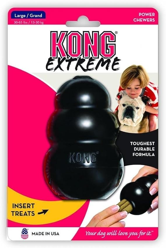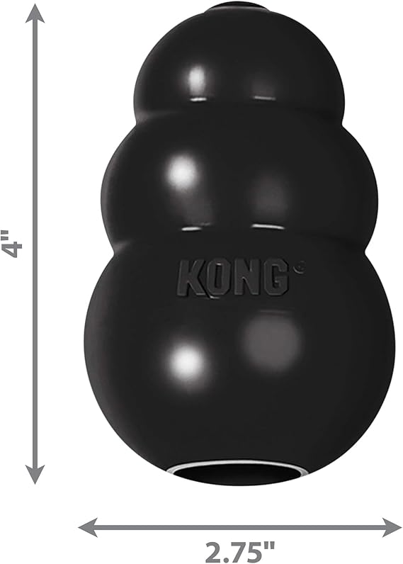 KONG extreme Is the most durable version of our original KONG toy. The ultra-strong, ultra-durable, Black rubber compound is recommended for the most powerful chewers. Our super-bouncy, Black natural rubber compound is unequaled for dogs who like to chew. Stuffing healthy treats into a KONG keeps dogs happily working and out of trouble for long periods of time.