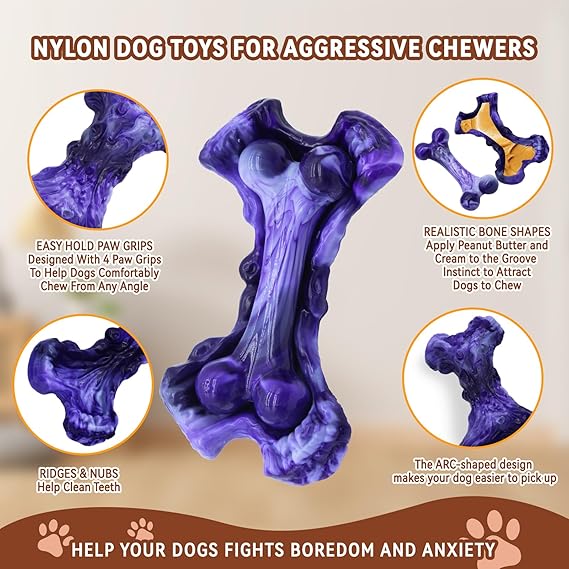 Magicorange Tough Dog Toys, Chew Toys for Aggressive Chewers, Dog Bone Toy Nylon Almost Indestructible Dogs Toy for Teeth Cleaning and Training (Purple)