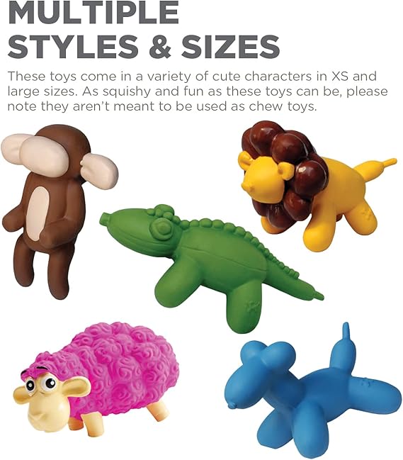 The brightly colored and bouncy Latex Rubber Balloon collection from Charming Pet is designed for interactive and solo play. These soft and squishy dog toys are made from natural latex rubber that is phthalate-free and lead-free paint for worry-free fun. Filled with polyfill and a squeaker to mimic the feel of prey and entice your dog to play. Great for indoor and outdoor play, these toys can be easily cleaned with warm water and soap. Available in XS and large sizes and multiple adorable animal characters to fit your pup's personality. Note, the Latex Rubber Balloon dog toys aren't meant to be used as chew toys. SAFETY AND CARE: When choosing a toy, make sure to choose an appropriate size toy for your dog. No toy is indestructible. ALWAYS supervise your dog when using a toy of any kind. Inspect toys regularly for damage and remove and replace if broken, or if parts become separated, as serious injury may result. Intended for dogs only. Keep out of reach of children.