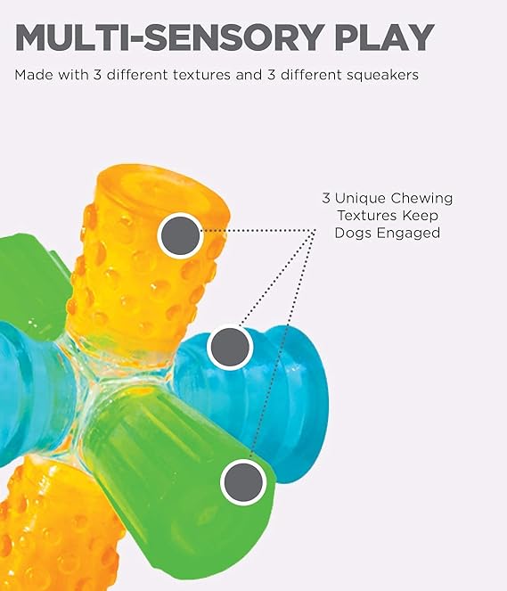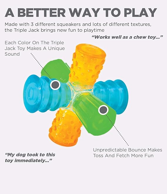 The Triple Jack interactive dog toy by Outward Hound offers a multi-sensory play experience with three different sounds and textures! Each color corresponds to either a squawk, grunt, or squeaky squeaker and a unique ribbed texture that is intriguing and gentle on the gums. Made from TPE rubber, this dog toy is durable enough for both indoor and outdoor playtime and can easily be rinsed with warm water and soap. SAFETY & CARE: No toy is indestructible. Choose toy based on pet size and playing habits. Toys should be inspected regularly and not left with any dog unattended. If damage occurs, replace toy immediately. Intended for dogs only. Keep out of reach of children.