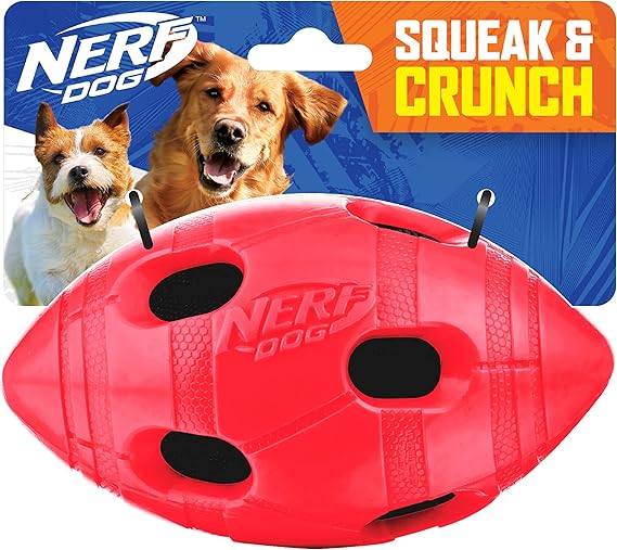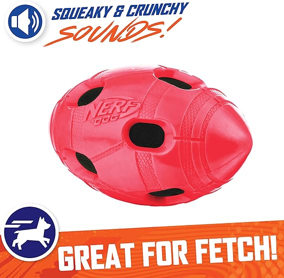 Take your game of fetch to the next level with the Nerf Dog TPR Red crunch & squeak Bash football! The crunching and squeaking Noises make this ball a drool-worthy toy that dogs love. Dual textures of the outside TPR rubber and interior crunch keep dogs entertained for hours! The durable TPR rubber body stands up to extended play and keeps the football light, but strong. Perfect for the pool or lake, this football is light enough to float! Built with safety in mind, This football is made of 100% non-toxic materials.