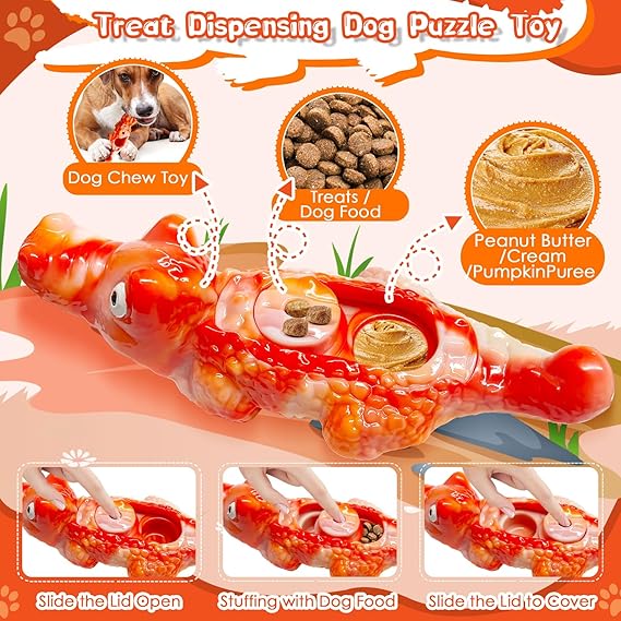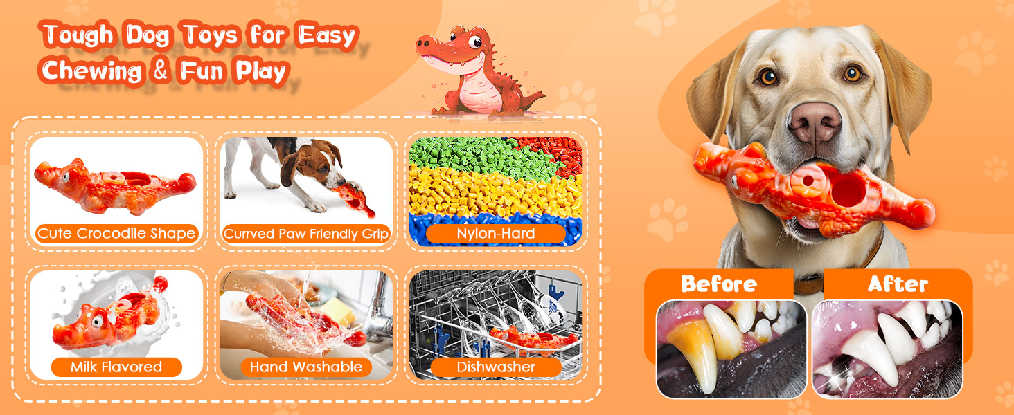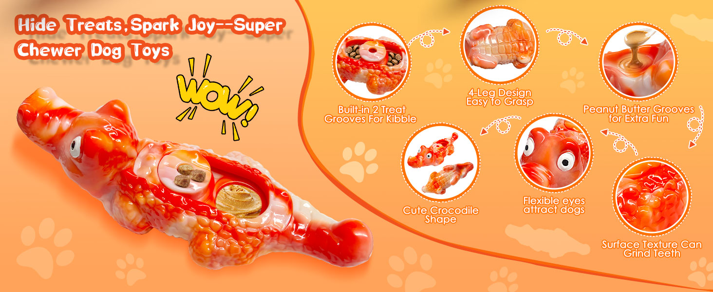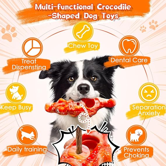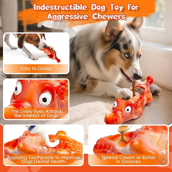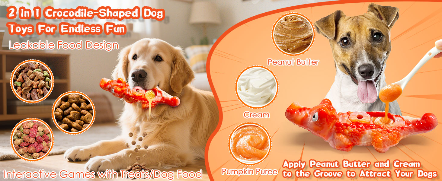 - 【Crocodile-Shaped Dog Toys】Designed with a crocodile shape dog chew toys in bright orange color, captures your dog's interest with its playful design, complete with googly eyes
