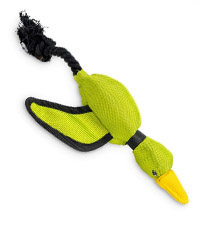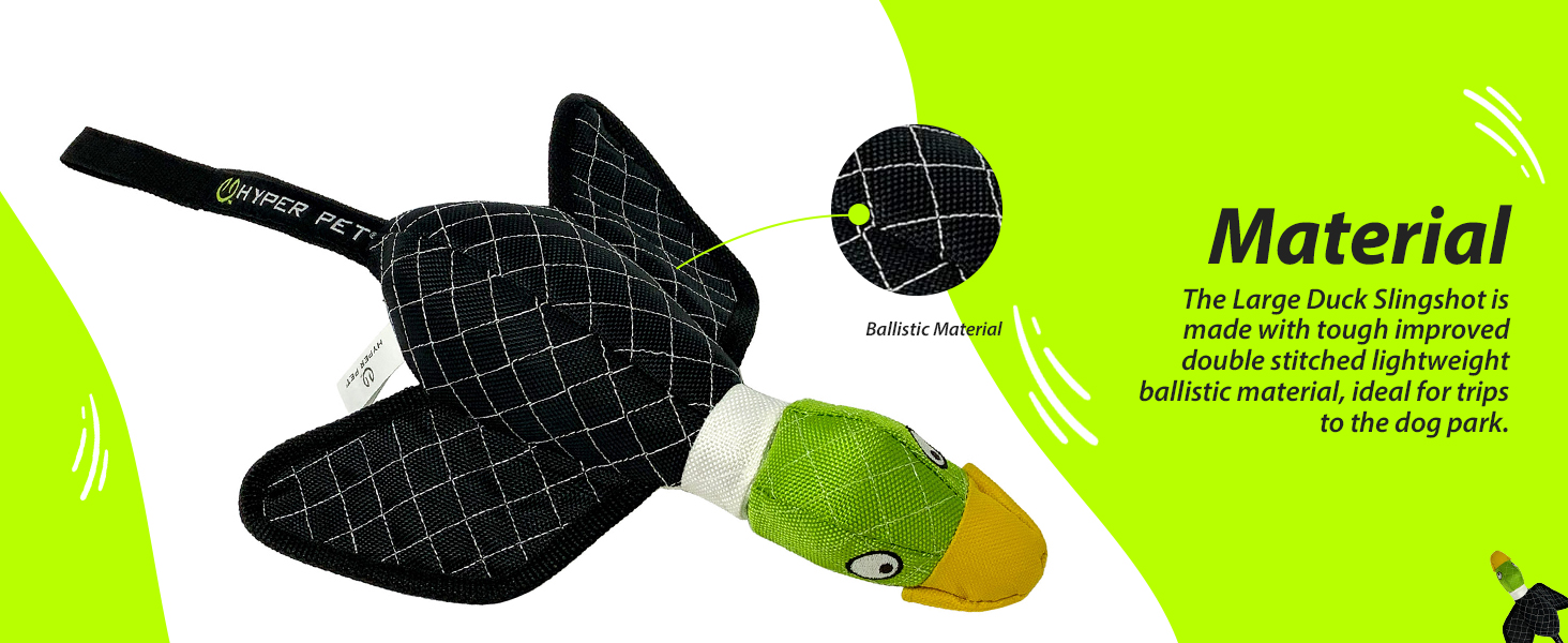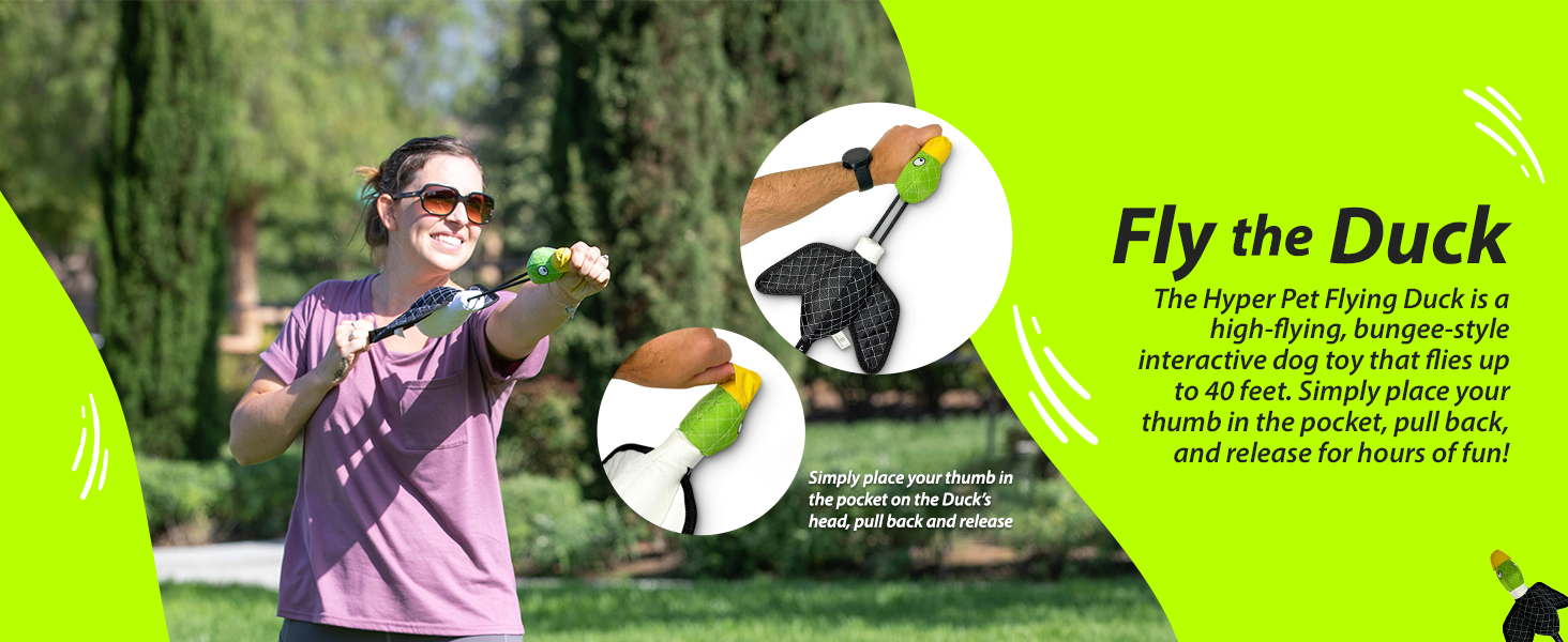 - Slingshot Dog Toy: The new and improved Hyper Pet Flying Duck is a thumb released, high flying, bungee style interactive dog toy that flies up to 40 feet. Place your thumb in the pocket on the duck’s head, pull back the body, and release for hours of fun.