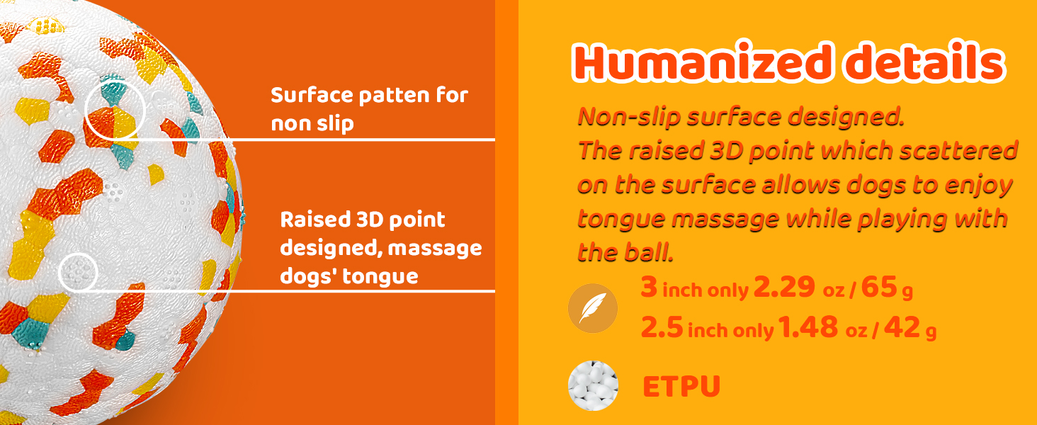 - Enjoy Massage - Non-slip surface designed. The raised 3D point which scattered on the surface allows dogs to enjoy tongue massage while playing with the ball.