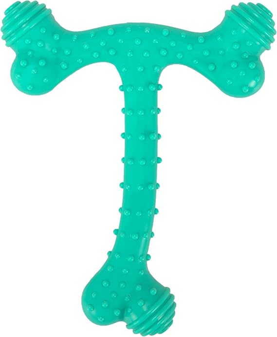 Your dog will love this durable, peanut butter-flavored chew toy. While Fido is having fun gnawing on this bone toy, the TPR nubs get up to the gum line for a good cleaning. The unique Tri-bone shape makes it easy for pets to hold their super chewer toy between their front paws and reach with their back teeth - keeping dogs busy for hours. The constant scrubbing action from chewing helps remove tartar and plaque build-up, which will help your dog’s teeth stay clean and free from dental issues. Of course, regular brushing is the best way to ward off bad breath, gum disease, and other mouth infections, but this tasty chew toy can help and it keeps your dog happy, too! This stuffing-free dog toy & quiet dog toy that your pup can chomp anytime - whether you're in your 3rd virtual meeting of the day or rocking the baby to sleep, this is a quiet distraction for your active pup! This tough nylon dog toy is designed as a dog toy for dogs that love an occasional chew session. It is one of the most loved small dog toys. Dog dental toys like this dog toy is a great item of dog stuff. Puppy toys, dog toys, dog dental toys ,dog toys for moderate chewers, puppy teething chew toys, interactive dog toys, and dog chew toys like these are interactive dog toys that could be part of a dog tooth brushing kit. Add to your dog grooming supplies with this dog dental care product and get fresh breath for dog. Toys for dogs like this dog toy could be dog squeaky toys for big dogs or small dogs depending on the size of the toy. Interactive dog toys like this dog chew toy can be useful for dog teeth cleaning and dog oral care. This super chewer dog toy can be a fun dog toy for indoor play or outdoor play time. Kong dog toys are also fun dog toys or puppy toys. Warning: As with all chew toys, please supervise use and remove all separated parts . Product is not intended to be eaten or ingested.